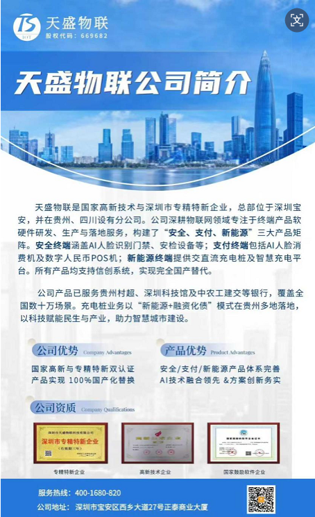 深圳市天盛物联科技有限公司,是一家专注于物联网(IoT)技术研发与应用的高科技企业。公司致力于为智慧城市、工业互联网、智能家居等领域提供创新的物联网解决方案,涵盖硬件设备、云平台及大数据分析服务。凭借自主研发的核心技术,天盛物联已成功服务多家公司和政府,并拥有多项专利和软件著作权。未来,公司将持续推动物联网技术的智能化升级,助力企业数字化转型,打造更高效的互联生态。