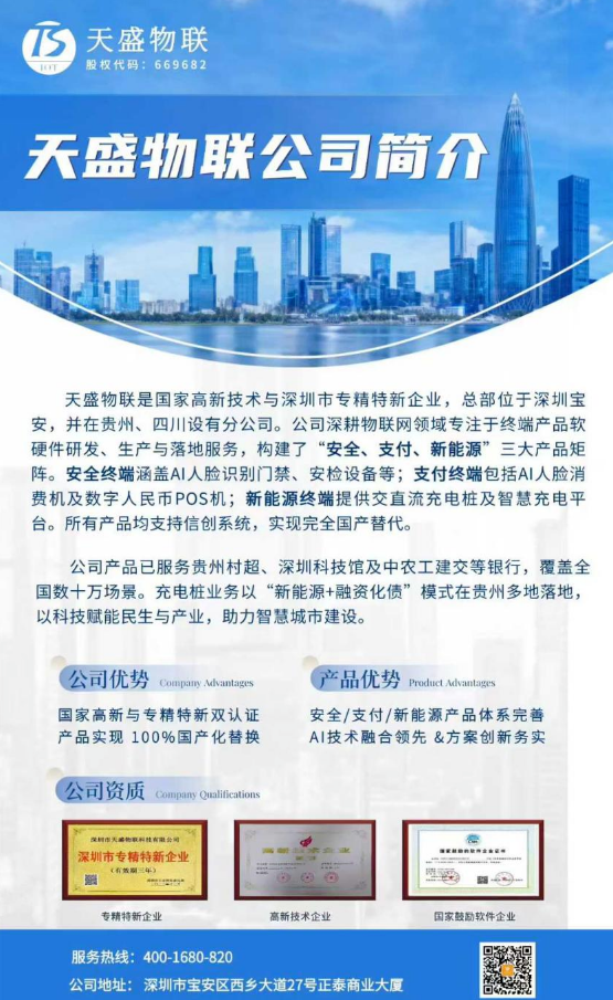 天盛物联是国家高新技术与深圳市专精特新企业,总部位于深圳宝安,并在贵州、四川设有分公司。公司深耕物联网领域专注于终端产品软硬件研发、生产与落地服务,构建了“安全、支付、新能源”三大产品矩阵。
