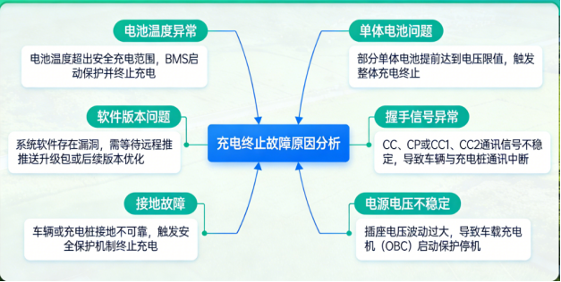诊断建议:更换已知正常的充电桩测试,若故障消失可继续观察使用;若故障反复出现,建议到店检修。维修人员可通过后台数据,分析故障发生时线束状态、握手信号、软件版本、电池温度及电压变化,缩小诊断范围,结合工作原理定位故障点。
