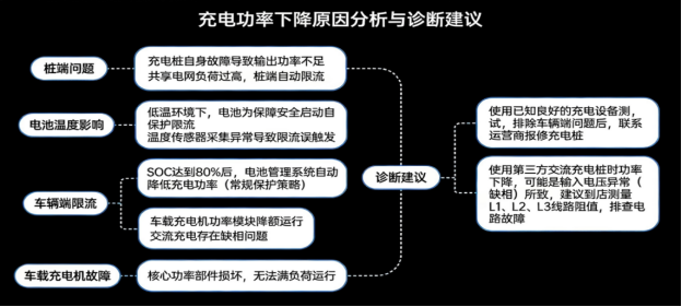 故障现象:实际充电功率显著低于充电桩标称功率,或未达到车辆理论最大充电功率,充电时长明显延长。